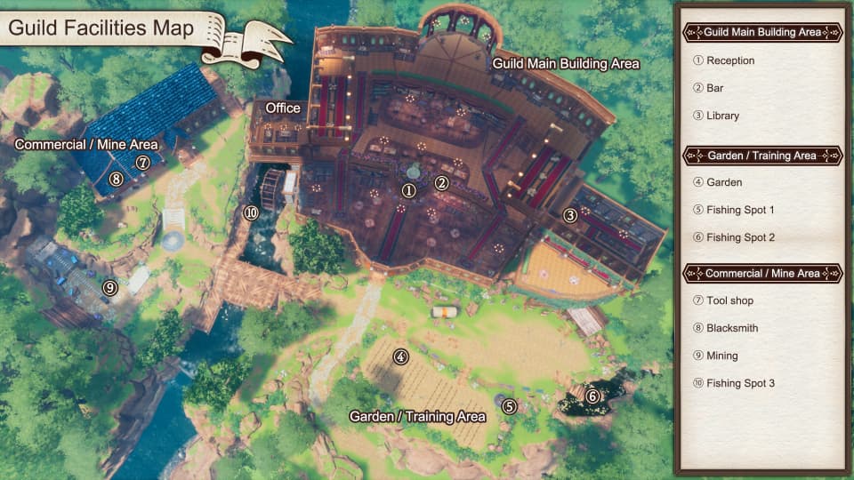 Up to 19 parties of adventurers reside on the guild map. The parties engage in various conversations, and players can join in by talking to them. By communicating with each party, party events can be triggered and progressed.